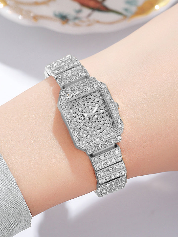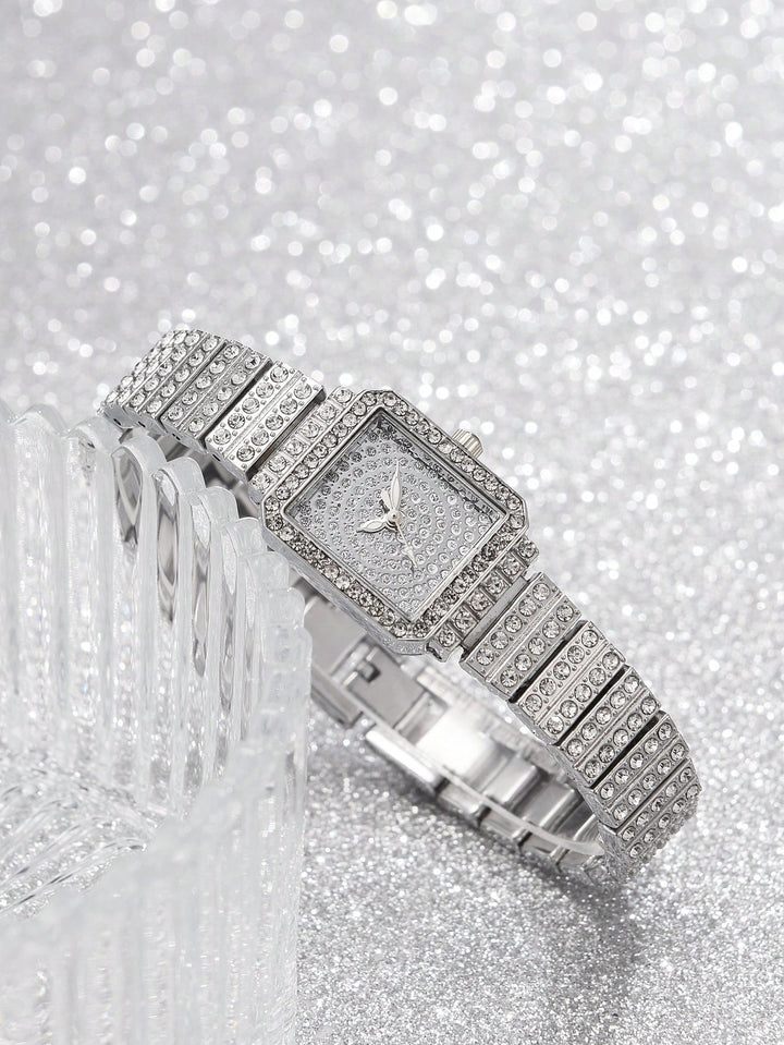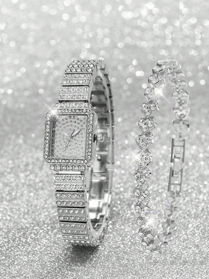 Shein - 1pc Women Silver Rhinestone Decor Zinc Alloy Strap Glamorous Square Dial Quartz Watch & 1pc Chain Bracelet, For Gift