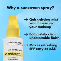 - Clear setting spray with broad spectrum SPF 45 sunscreen
