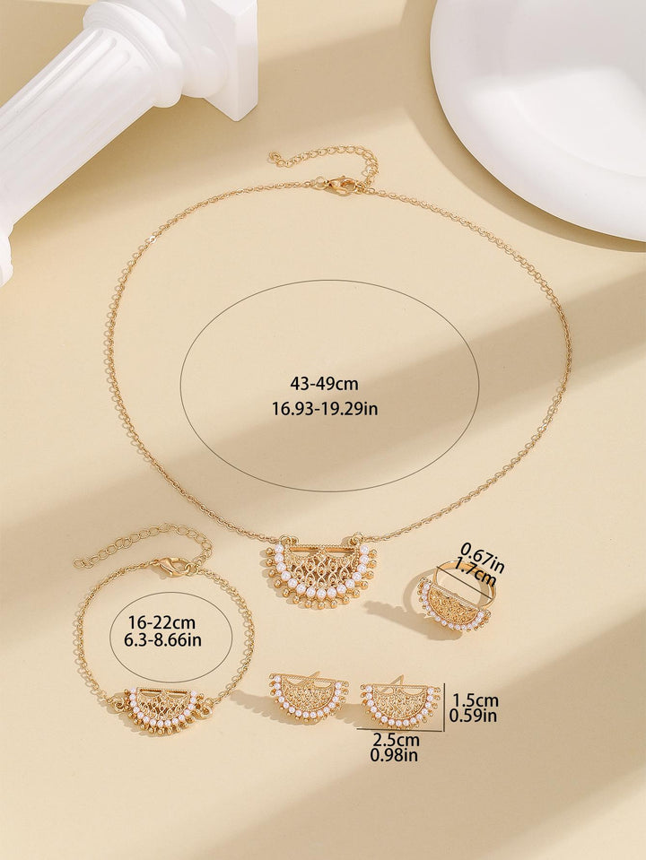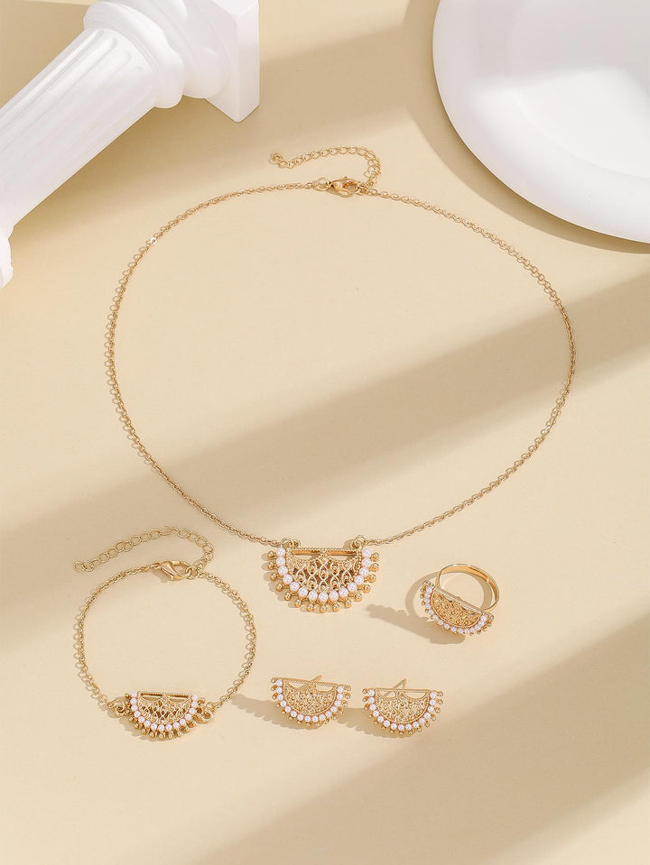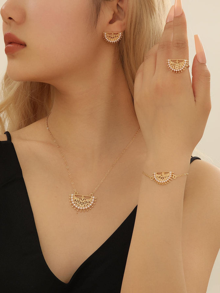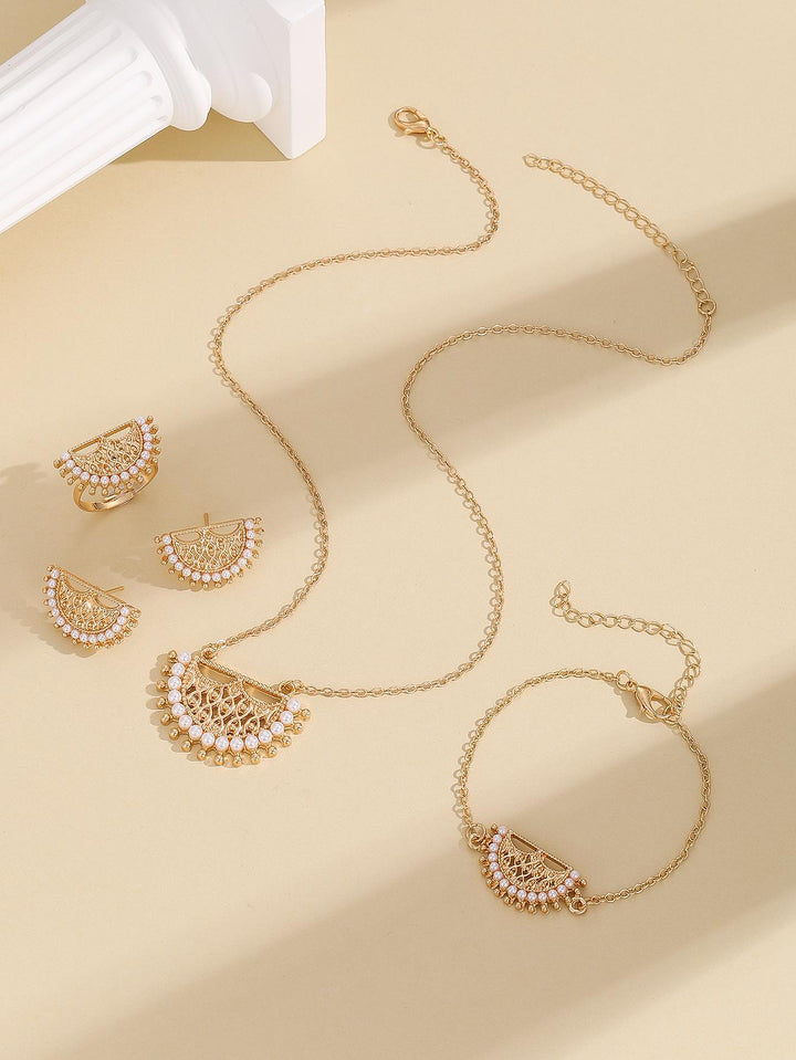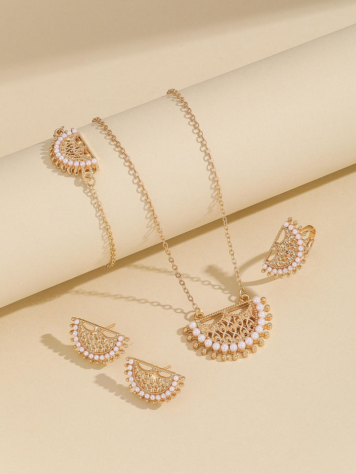 Shein - Fashionable Zinc Alloy Faux Pearl & Hollow Out Necklace, Earrings, Ring And Bracelet Set, In Gold