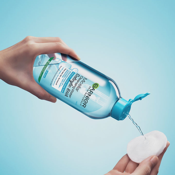 STEP 1: REMOVE MAKEUP & IMPURITIES with the Garnier Salicylic Acid, BHA Micellar Water. Saturate a cotton pad with the micellar water and gently wipe your face with it to remove all makeup and dirt.