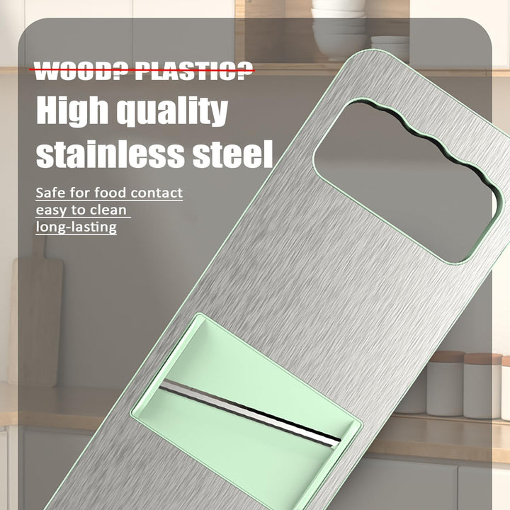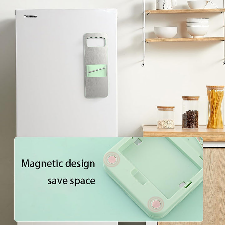 - ✔INNOVATION DESIGN: Professional vegetable slicer features humanized design, using sturdy and long-lasting stainless steel panel, magnetic on the back for attached to the fridge. Hand guard of food processor keeps your safe, ergonomic grips and collection tray with non-skid base ensure good stability and prevent food from falling during slicing.