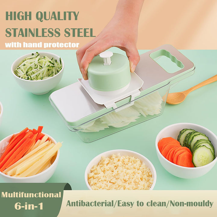 - ✔6 INTERCHANGEABLE BLADES: Multi-purpose mandoline vegetable chopper includes 1 coarse grater, 1 fine grater, 1 thick slicer, 1 thin slicer, 1 wave blade and 1 shredder. Veggies cutter adopts rust-resistant heavy-duty stainless steel blade ensuring the sharpness for effortlessly slicing or cutting, suitable for most kinds of fruits and vegetables.