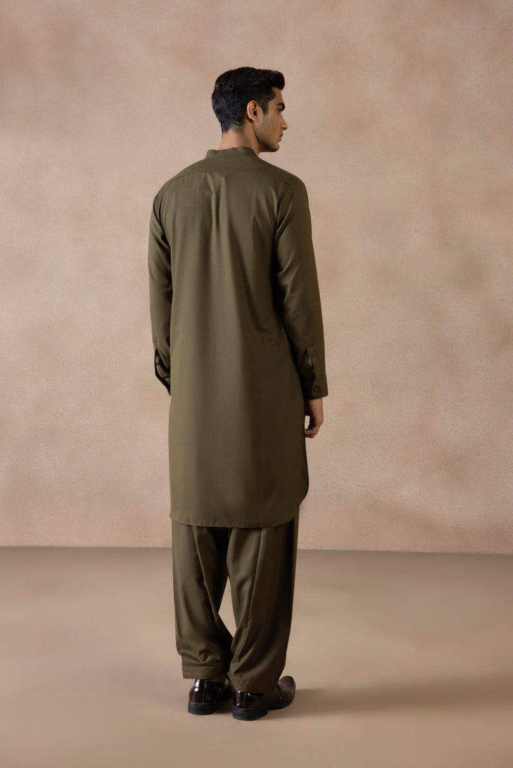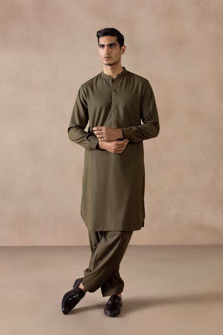 Uplift your style this winter with this rust brown hued two-piece luxury wash & wear ensemble featuring band, cuff sleeves and a matching shalwar.