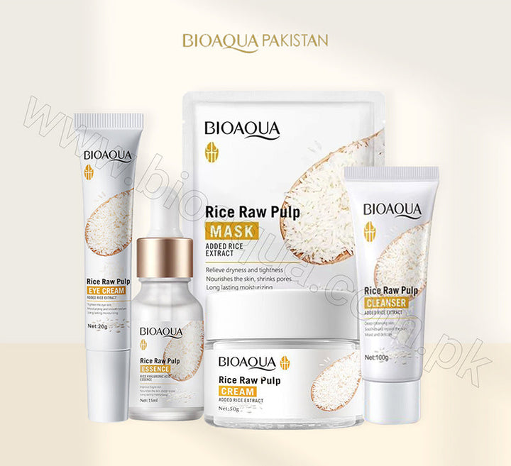 - Pack of 5 Bioaqua Glow & Glowing Rice Skincare Series.1 Piece Rice Raw Pulp Cream 50g BQY797061 Piece Rice Raw Pulp Cleanser 100g BQY838401 Piece Rice Raw Pulp Eye Cream 20g BQY838951 Piece Rice Mask 30g HC6321)1 Piece Rice Raw Pulp Serum BQY80535