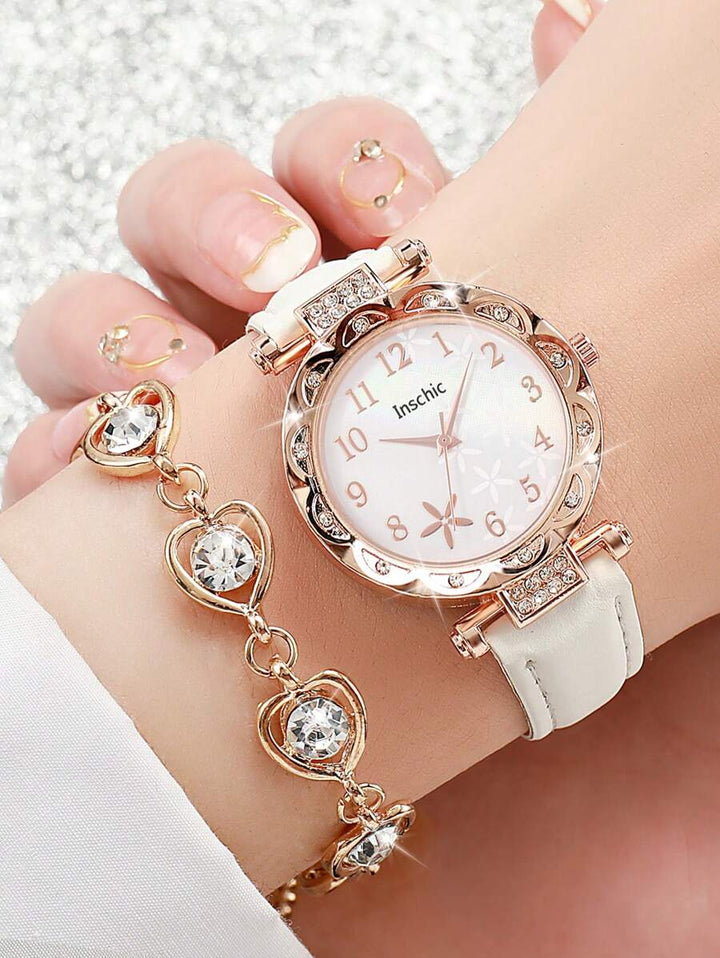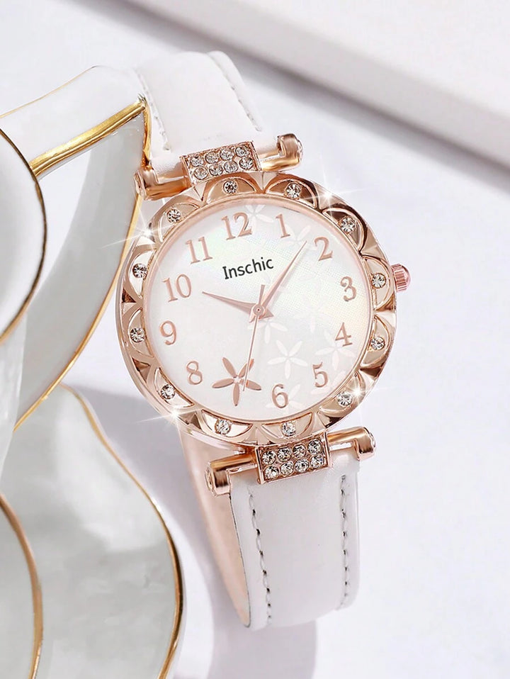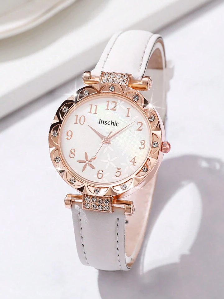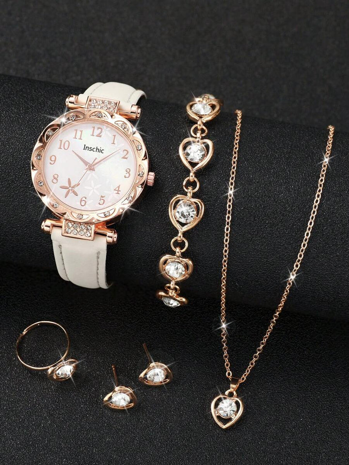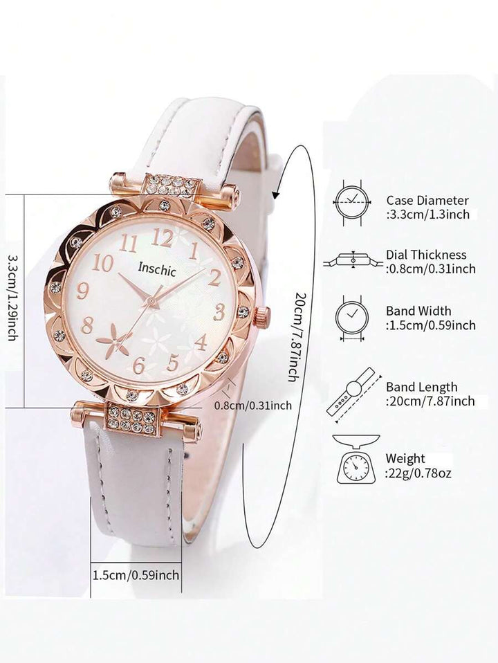 Shein - 6pcs/Set Women's Fashion Casual Rhinestone Floral Dial Quartz Wrist Watch