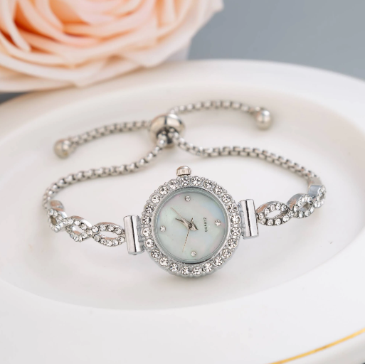 Shein - Cute Fashionable Women's Bracelet Watch - Deluxe Round Dial With Rhinestone & Water Pattern, Alloy Band & Quartz Movement