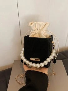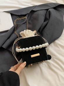 Shein - Mini Pleated Drawstring Box Pearls Fashionable Drawstring Pouch Clutch