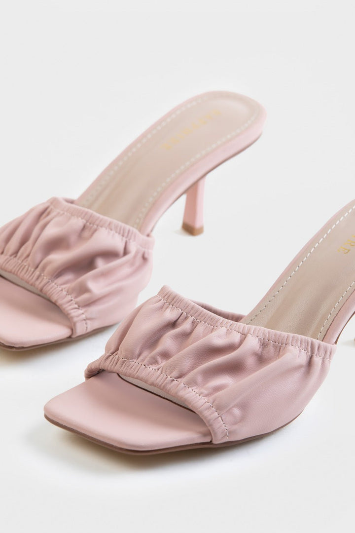 Step into these chic and trendy pink heels with a ruched strap.