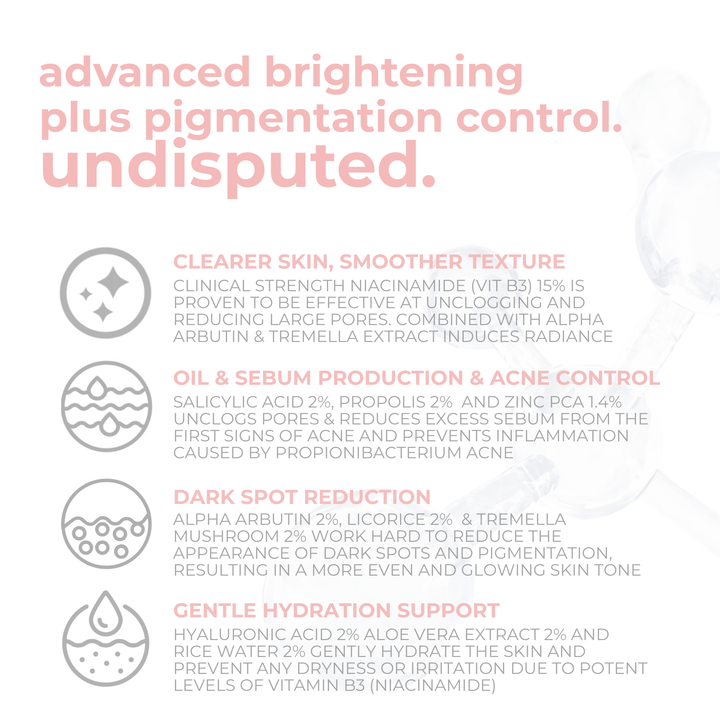 Salicylic Acid 2% unclogs pores and removes impurities to give oil and blemish control. Added Alpha Arbutin 2%, Tremella Mushroom Extract 2% and Propolis 2% naturally illuminates and smoothens the skin to give it a glowing radiant look.