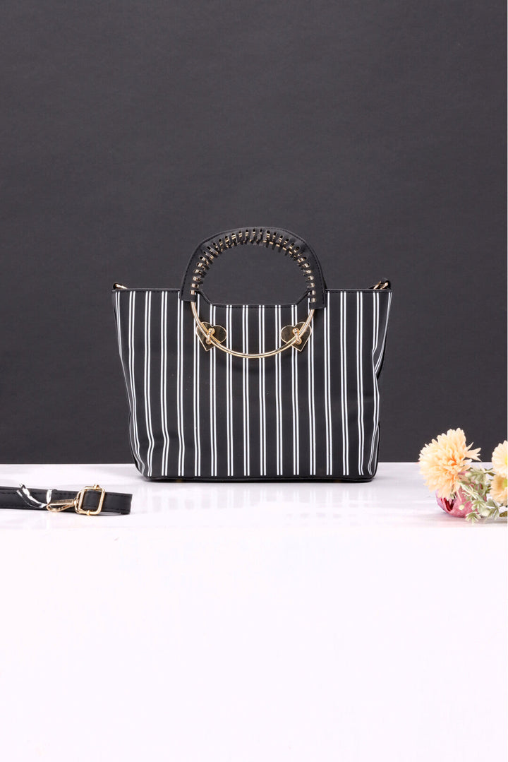 - This charming handbag boasts a playful pattern of stripes and a convenient round handle for effortless carrying.